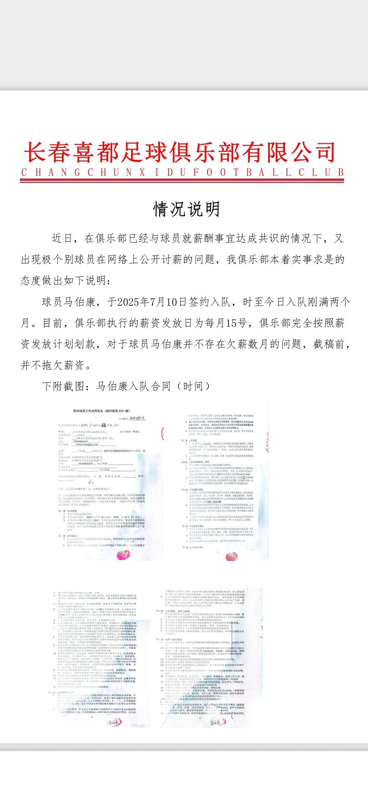 近日,在俱乐部已经与球员就薪酬事宜达成共识的情况下,又出现极个别球员在网络上公开讨薪的问题,我俱乐部本着实事求是的态度做出如下说明: